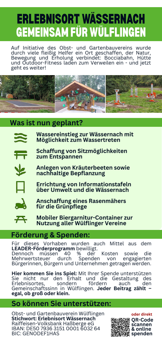 Gemeinsam wollen wir das neue Jahr begrüßen, den Zusammenhalt stärken und einen schönen Abend miteinander verbringen. Außerdem stellen wir an diesem Abend den 3. Bauabschnitt des „Erlebnisort Wässernach“ vor und rufen zu Spenden für die Weiterentwicklung dieses besonderen Platzes auf.