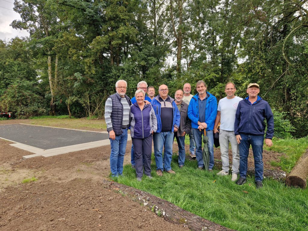 Die fleißigen Helfer, Vorstandsmitglieder und geladenen Gäste bei der offiziellen Einweihung der neuen Hütte an der Wässernachhalle in Wülflingen mit Bürgermeister Günther Werner (7. v.l.) und Projektbeauftragten Ines Heiduk (6. v.l.)